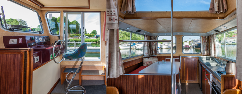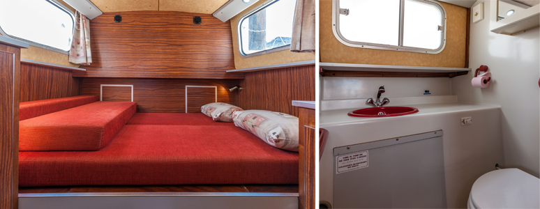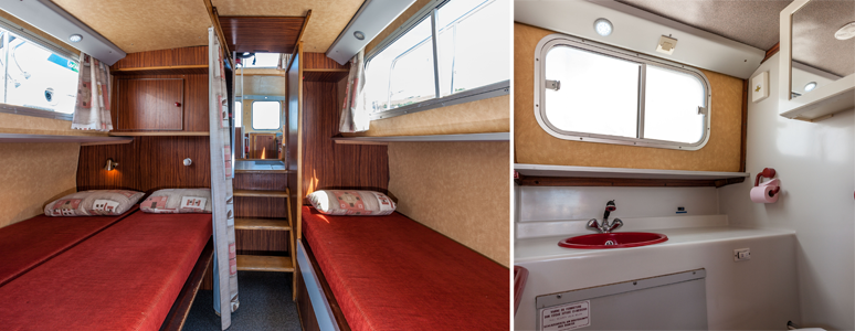 V přídi dvoukabina s umyvadlem, šatníkem a zavazadlovým prostorem. 1 dvojlůžko a 1 jednoduché lůžko ve střední části lodi s šatníkem a zavazadlovým prostorem. Pohovka v salonu se dá roztáhnout na dvojlůžko. Kabinka se sprchou, umyvadlem a WC. Kompletně zařízená kuchyně, salon.