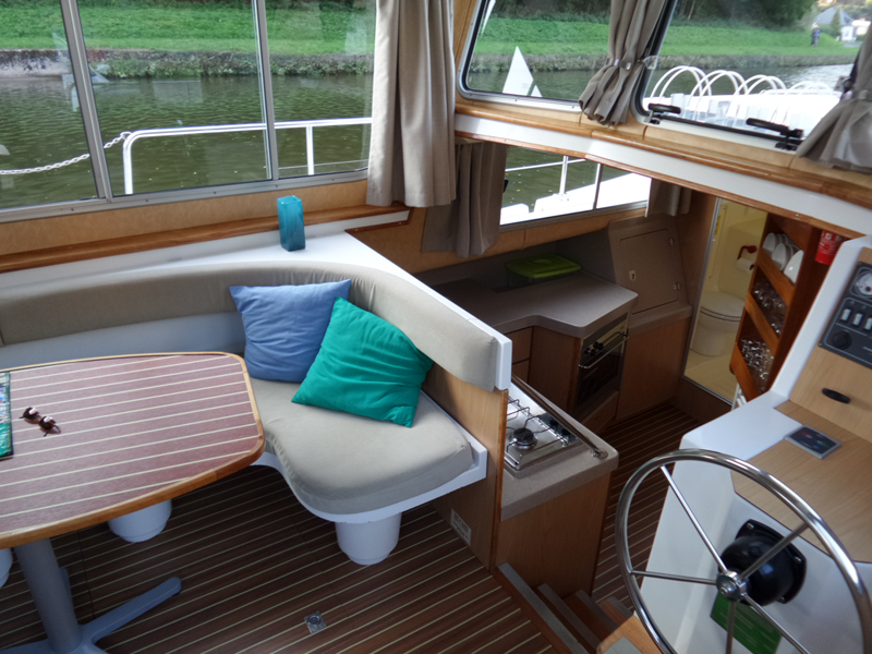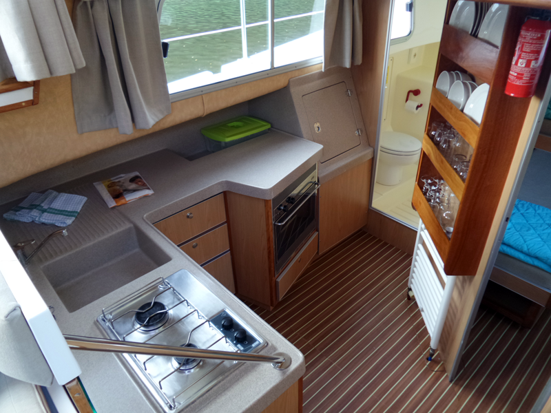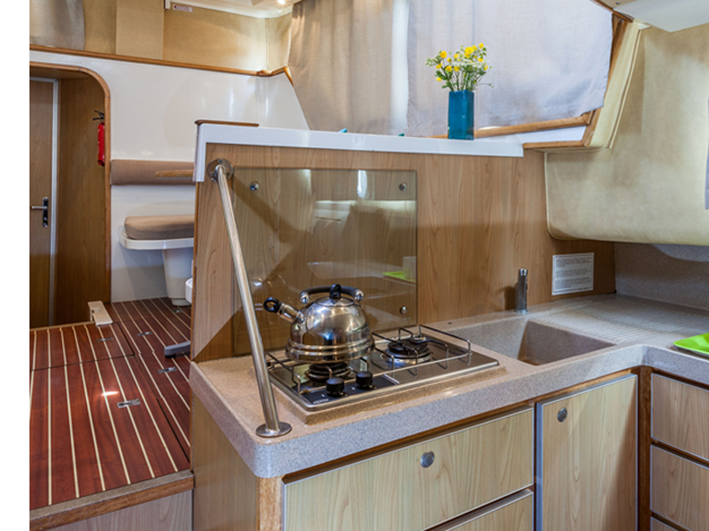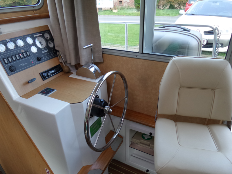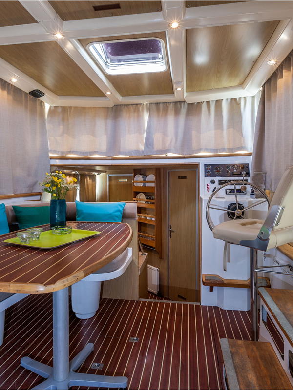 • ve středu lodě salon a kompletně zařízená kuchyně • 230V zástrčka (připojení ze břehu) • navýšené místo pro kormidelníka • kormidlo uvnitř a venku • Flying Bridge se stolem a židlemi • postranní trysky v přídi.