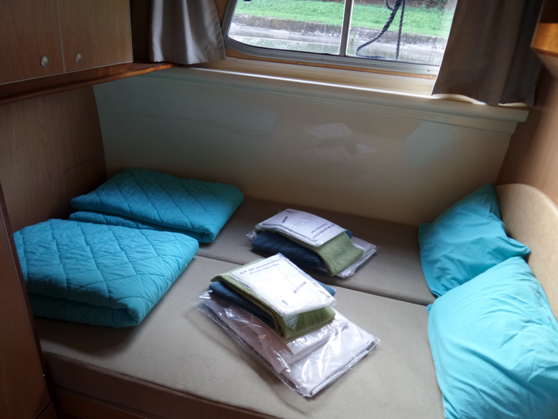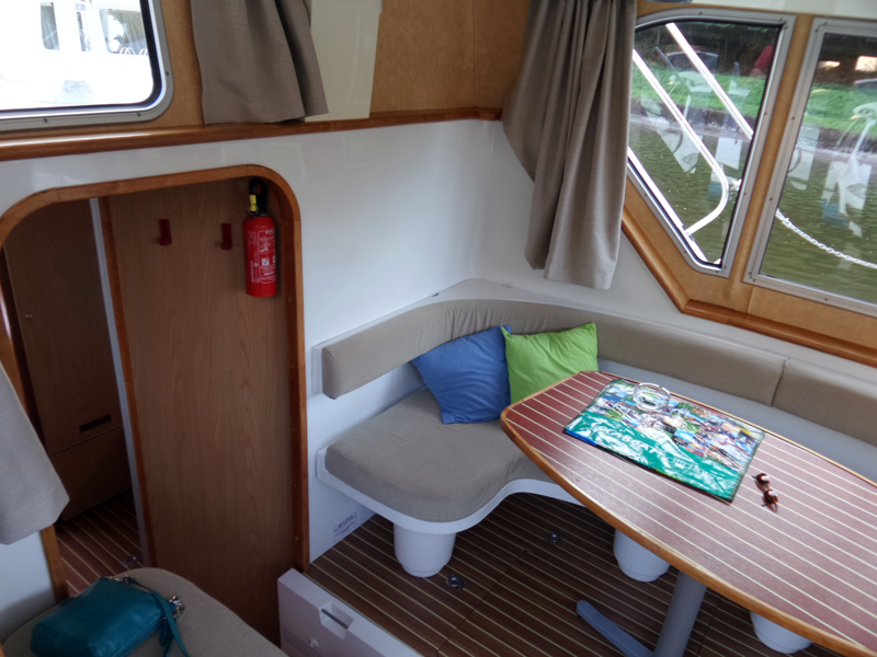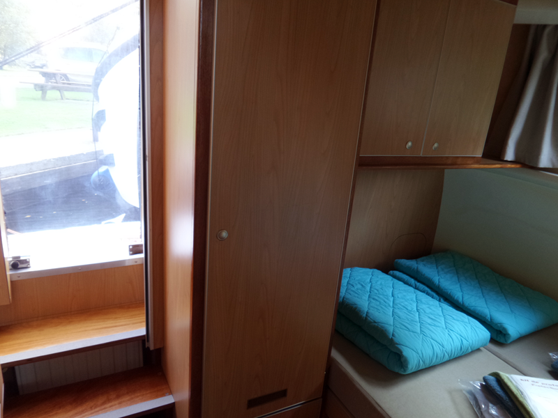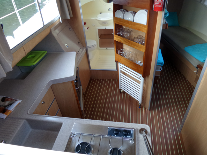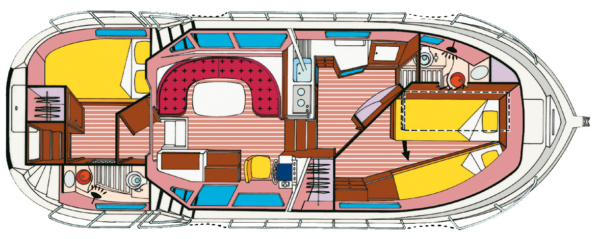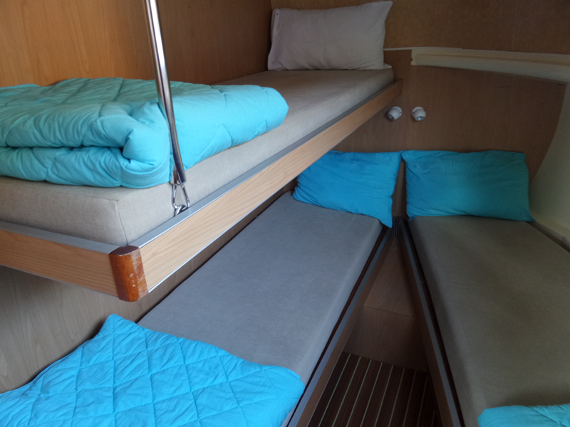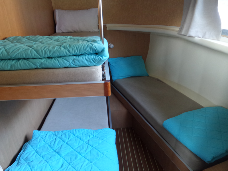 • V přídi dvoukabina s 2 nebo 3 jednolůžky (dají se upravit k dvojlůžku), šatník a zavazadlový prostor • 2 sanitární buňky se sprchou, umyvadlem a WC • v zádi 1 prostorná kabina s dvojlůžkem, šatníkem a zavazadlovým prostorem (kabina má přes prosklené dvěře vlastní výstup z lodě!).